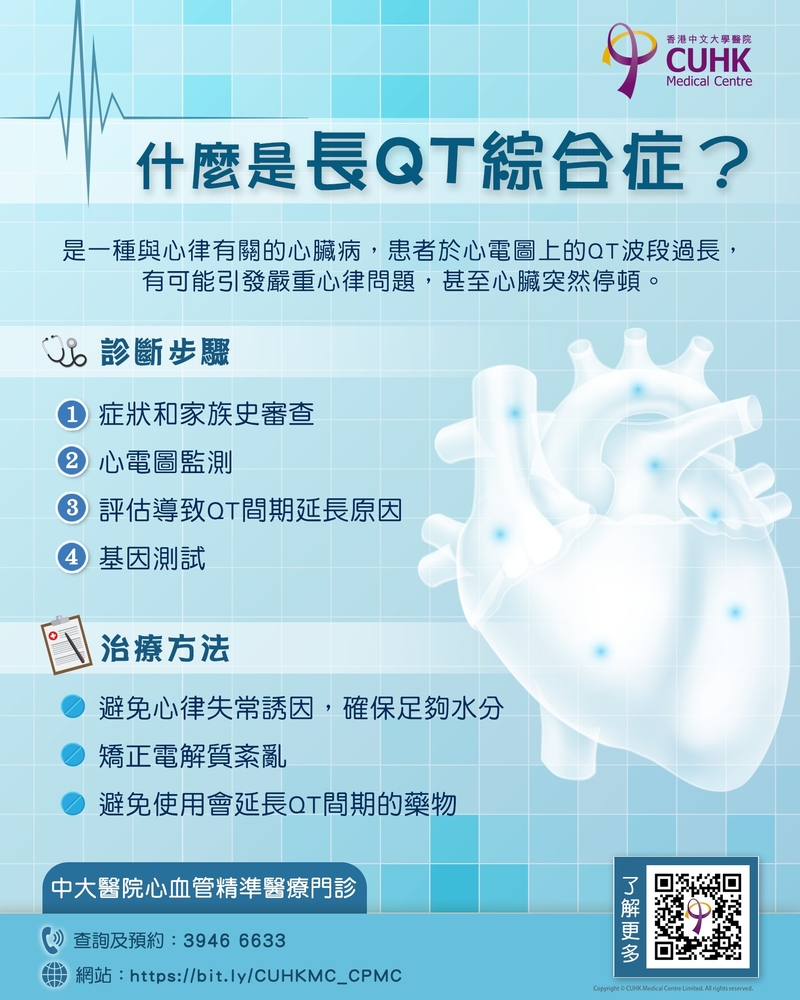 🫀長QT綜合症是一種與心律有關的心臟病,患者的心電圖會顯示QT波段過長,有機會引發嚴重的心律問題,甚至心臟突然停頓。長QT綜合症可以是先天性的,與基因異常有關,亦可以是後天性,由電解質不平衡或某些藥物引起。