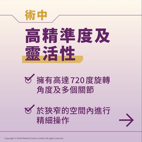 微創機械人的機械臂技術有高達720度旋轉角度及多個關節,醫生能靈活控制機械臂於狹窄的空間內靈活操作,提高切除精準度。