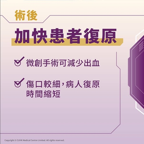 「微創機械人」這項技術已發展超過20年,並一直累積豐富臨床經驗。中大醫院配合最新發展,亦引進由「中大醫療機械人創新技術中心」自主研發的微創機械人手術系統,應用尖端科技為患者提供更豐富、更優化的治療方案,不僅能降低手術風險,更能優化術中到術後流程!